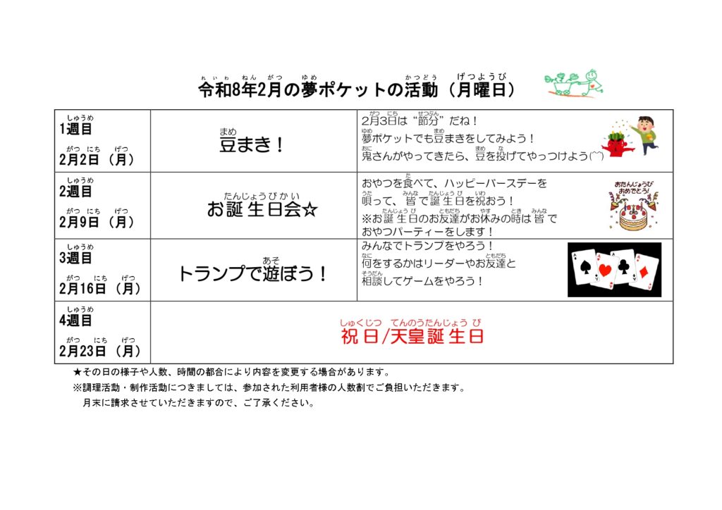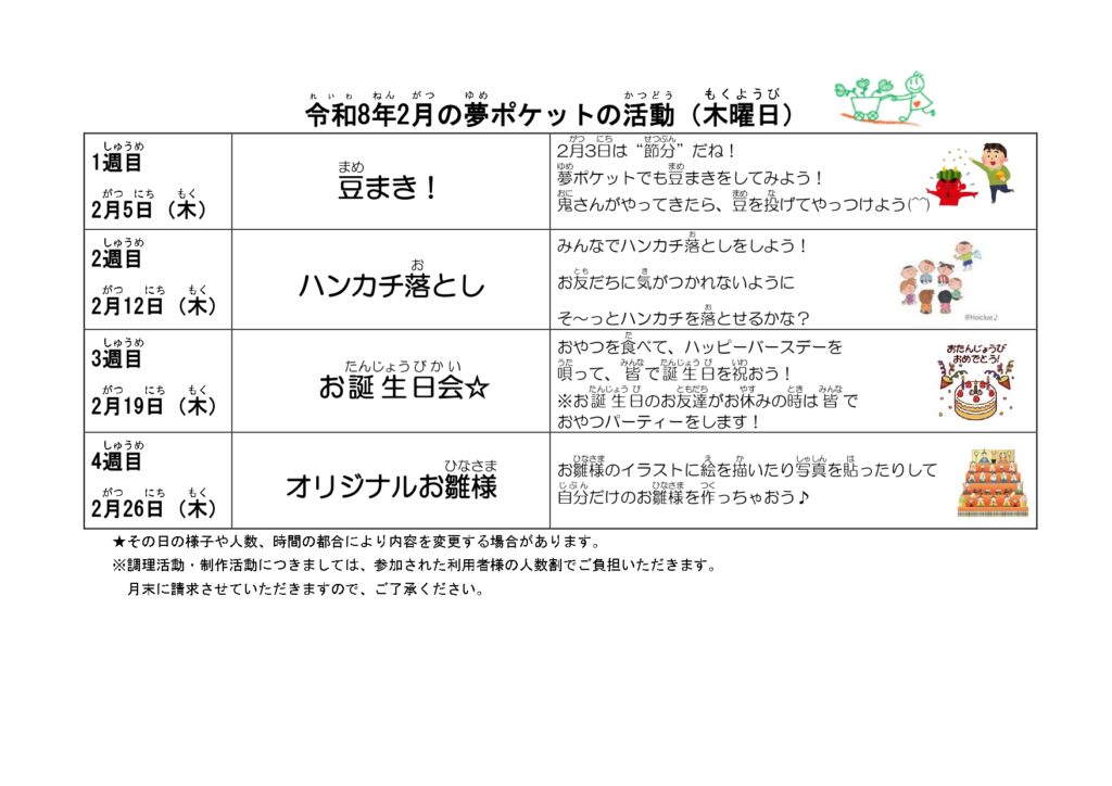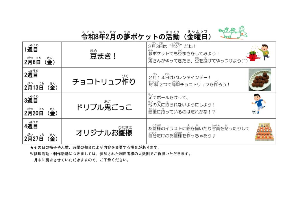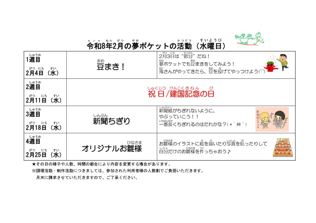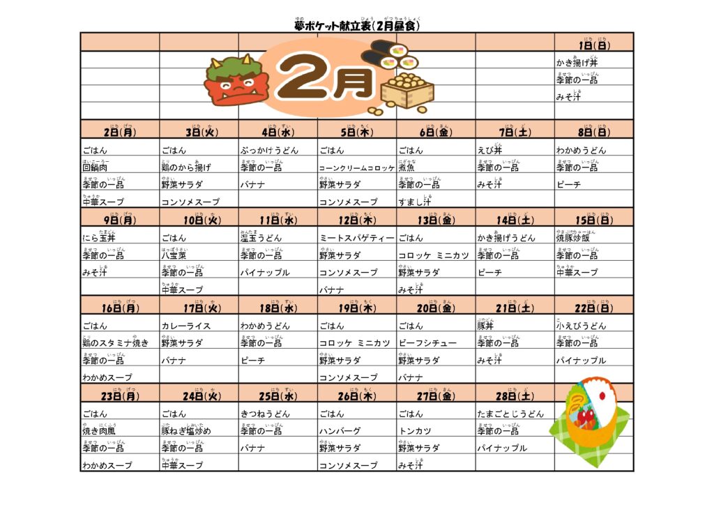 【児童事業部】2026年2月平日活動、給食献立表のお知らせです(^^)/